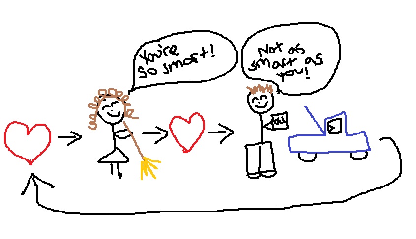It’s like this: “I love you so much, I am so happy to be with you, that it brings me joy to give your dog a bath. And while I’m washing the poo off your dog’s tail, I will think fond thoughts of you. Really, that’s how great this whole thing is. Later, I’m going to tell you how smart you are when you change my oil.” And when the girl tells the guy how smart he is, he’s all, “Aww, that’s so sweet!”