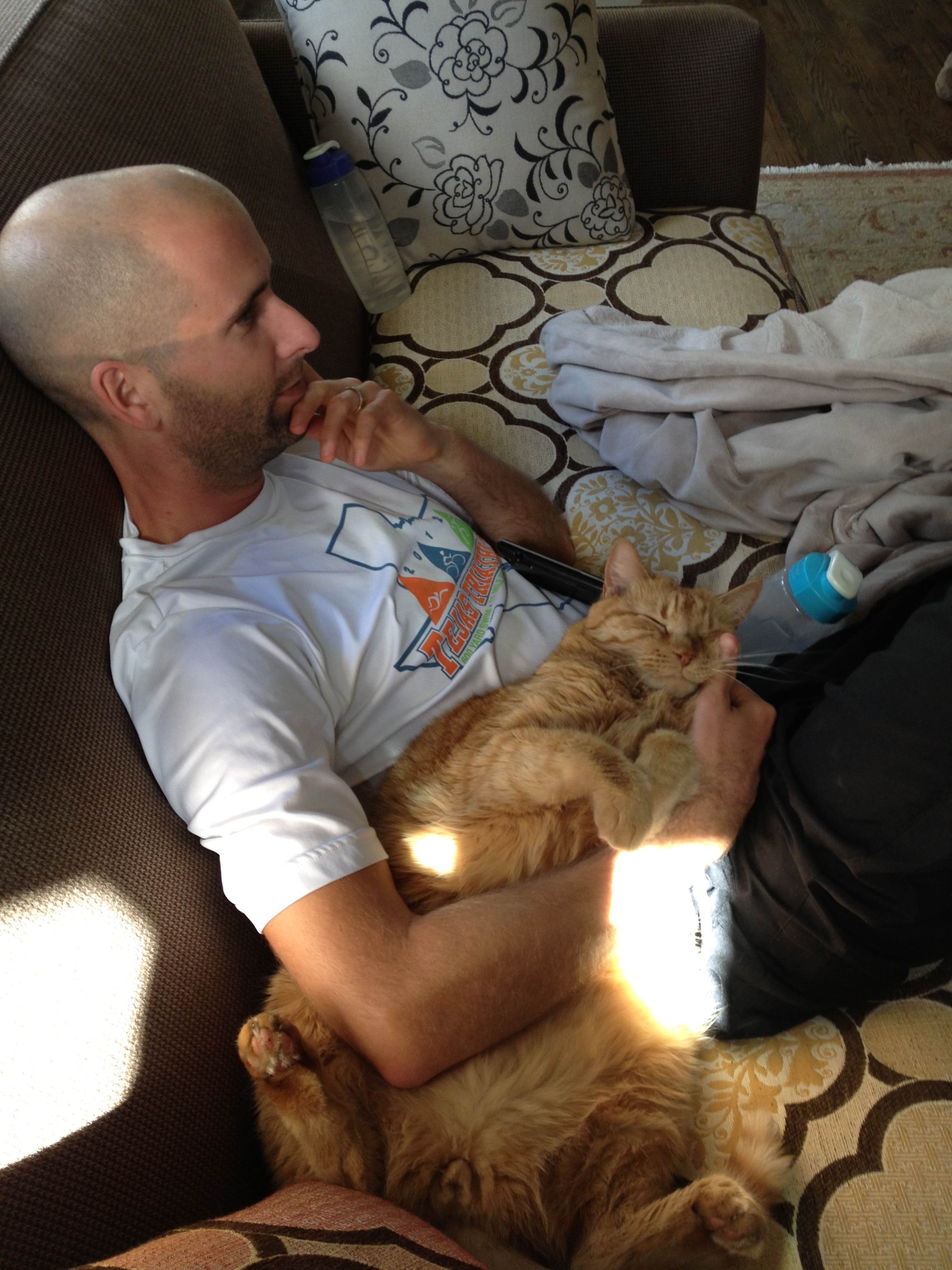 Here, Benson doesn’t love the cat after he calls, “Haaaarold! Haaaaarold! I want you to sleep with meee!” throughout the house until he finds him and pulls him into bed with us and shares his pillow with him: