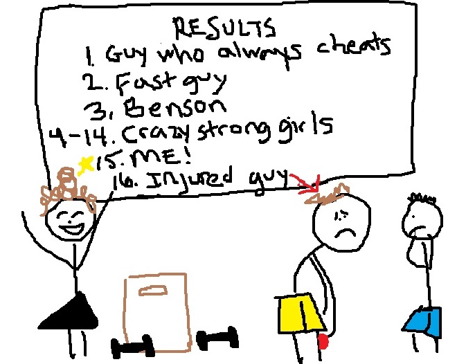 I came in second to last yesterday in CrossFit. The big win was a result of this guy with an injured knee. Do I care? Nope! Ran right past that sucka! After the workout, the loser grabbed his knee in agony and some people crowded around him while I pumped my fist into the air, basking in my victory.