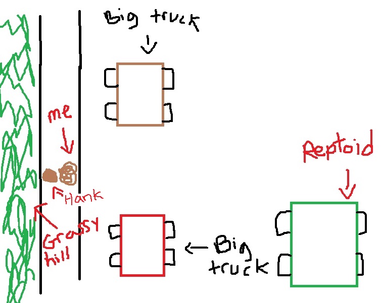 But in the second before Reptoid ran me over, Hank came up with a plan. The plan involved dragging me up the hill by one arm while being chased by a truck with fangs.
