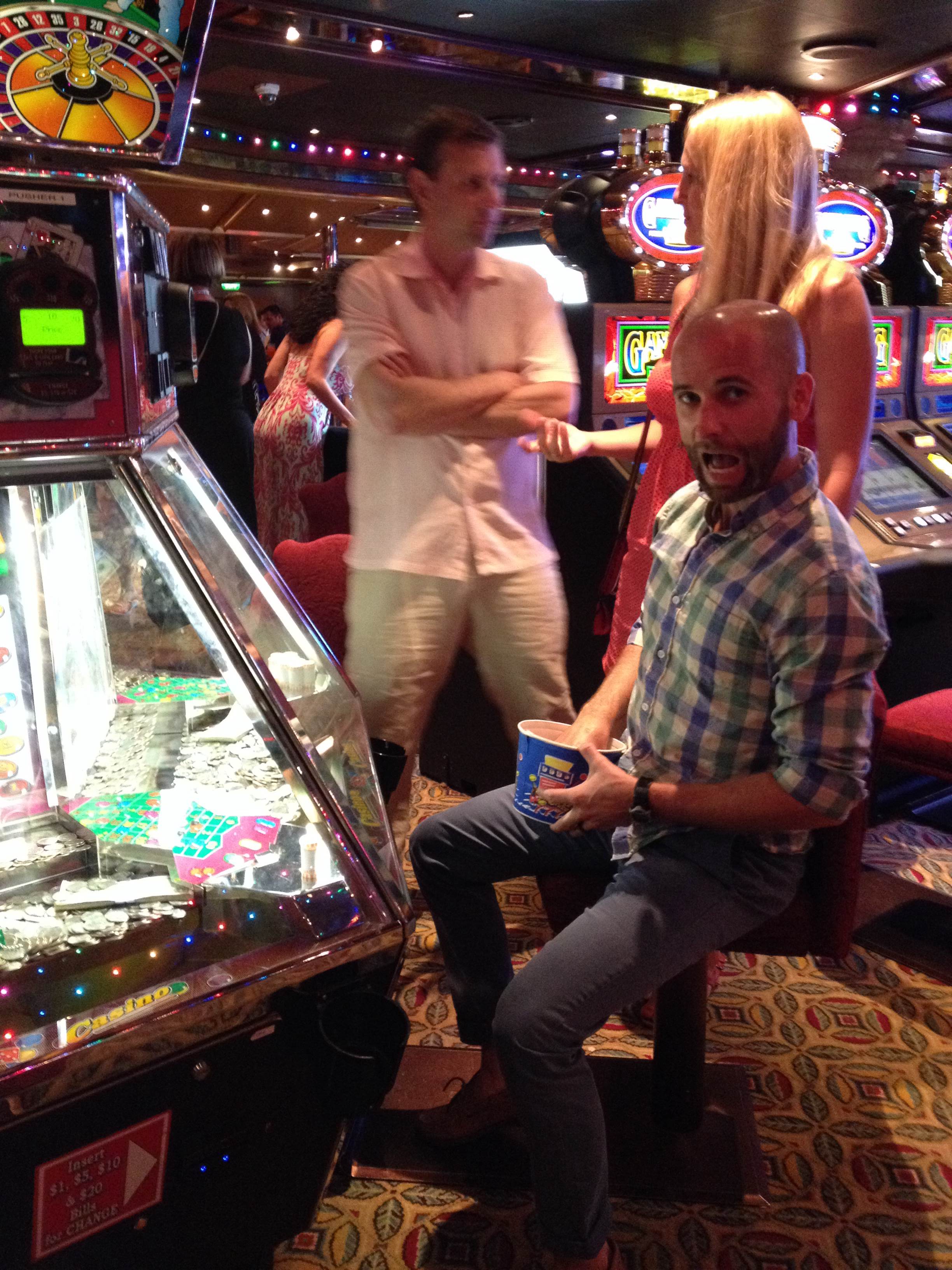 Benson picked up a handy gambling habit on the cruise. Note Jason and Heather in the background. (He’d just called her a milkmaid.)
