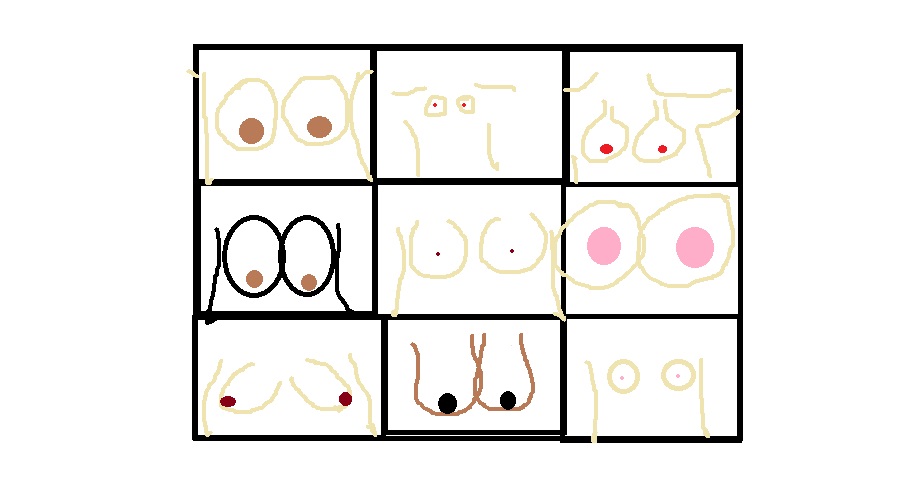 But I’m still so curious. What do other boobs look like? I never played sports, so locker rooms are places I’ve mostly seen on television. And while I know I could see lots of boobs – TONS of boobs! – at the click of a button, I fear porn would rot my brain. A few years ago Glamour Magazine ran an article on the whole mystery behind breasts. At the bottom of the page they posted a small photo with a Brady Bunch style grid showcasing all these different real life boobs. No faces, no bellybuttons, just boobs.