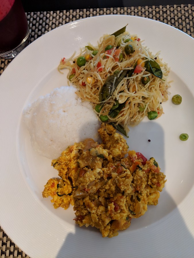 I realized that night that I needed to give up on my oatmeal and prayed that God would help me eat, because even that I cannot do on my own. I entered breakfast the next day with open hands. I watched the other eaters and eventually followed the lead of an Indian guest, placing a steaming rice cake on my plate and topping it with what I found in another pot labeled paneer bhurgji.