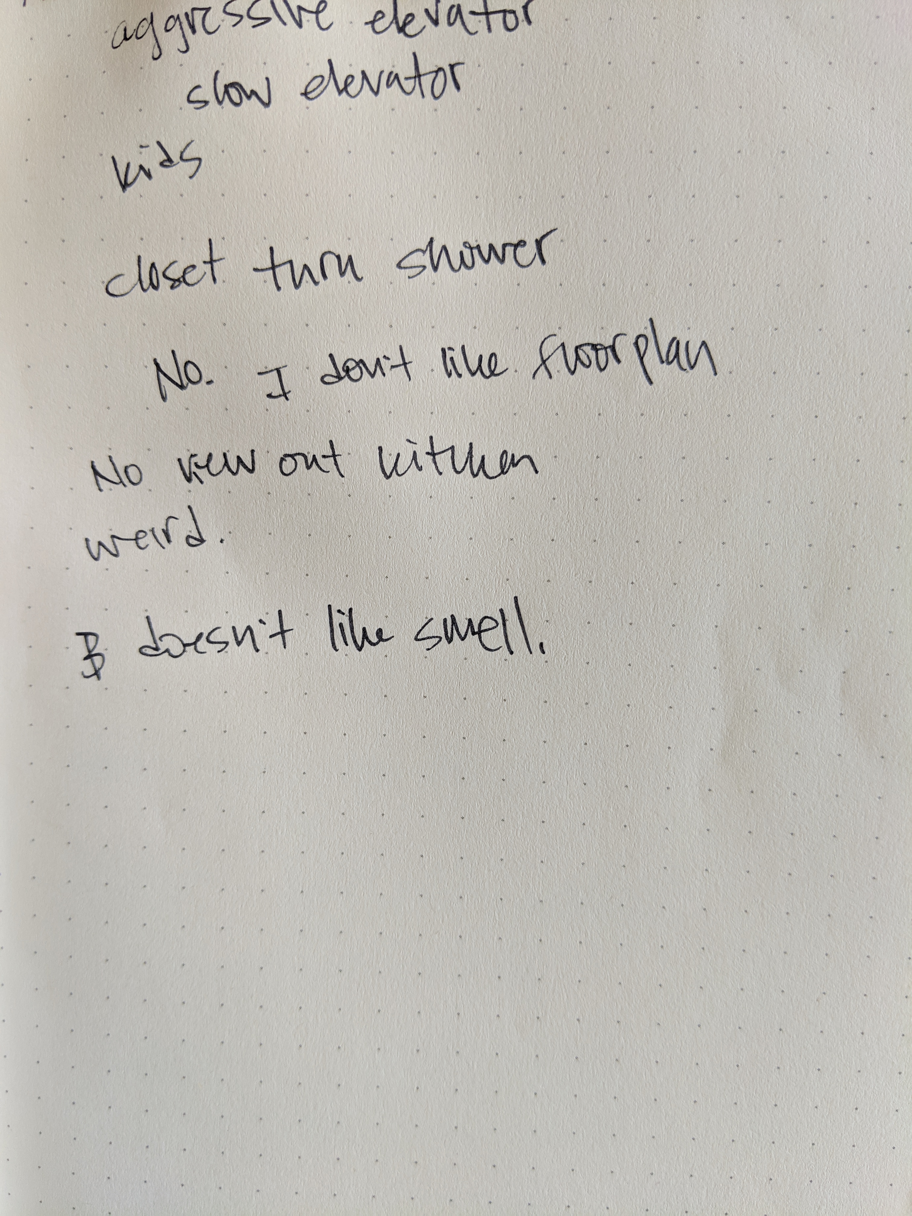Kids: Three adorable chubby Asian toddlers and their non-chubby mother waited on Slow Elevator with us. One chunky boy hid behind Benson’s leg once we got on. Then he kept waving at us and saying, “Bye!” Living near them would be a perk, but unfortunately even a cute baby wouldn’t make up for what we saw next.