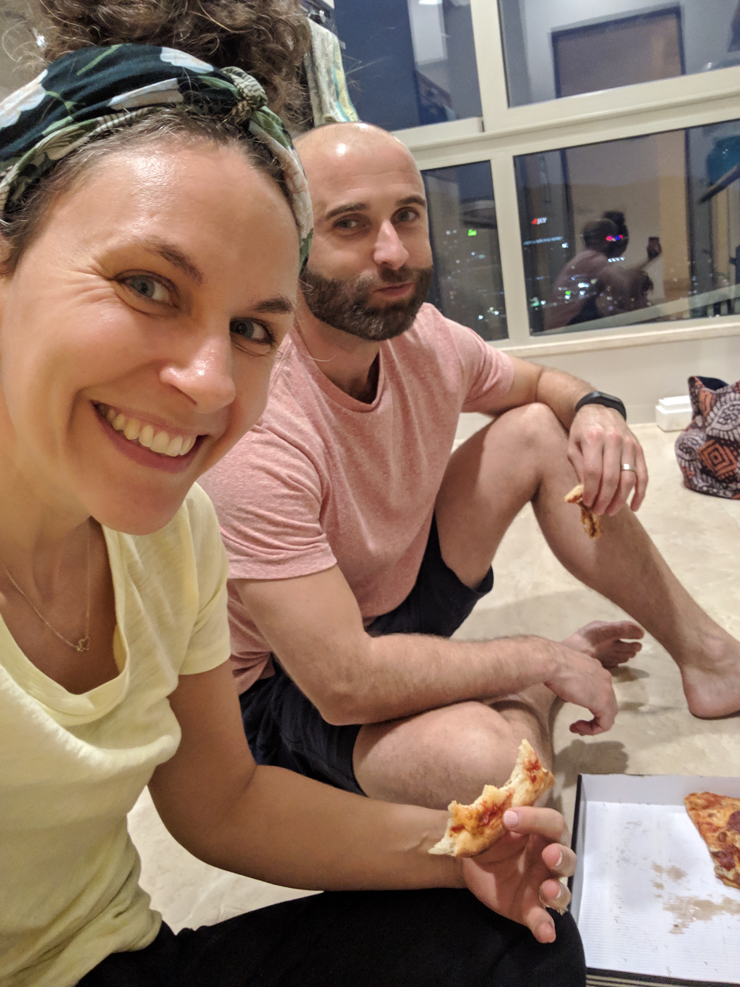 I have a million scenes in my head: the dusty man ringing my doorbell selling a coconut; fat cows confidently walking down the sidewalk in front delicate women draped in lavender and aqua fabric; the security guard at our gate who said, “I like mangos” when we offered him one, and then added, “I like you,” smiling wide and offering us a thumbs up; beet root hummus with tahini yogurt over vegetables and rice; the American coffee I pay a fortune for each morning but relish every sip of; a patio chair strapped to the back of a man on a motorcycle; Benson and I, sticky from walking in the heat, eating pizza straight out of the box on our kitchen floor because we have neither a table nor dishwasher.