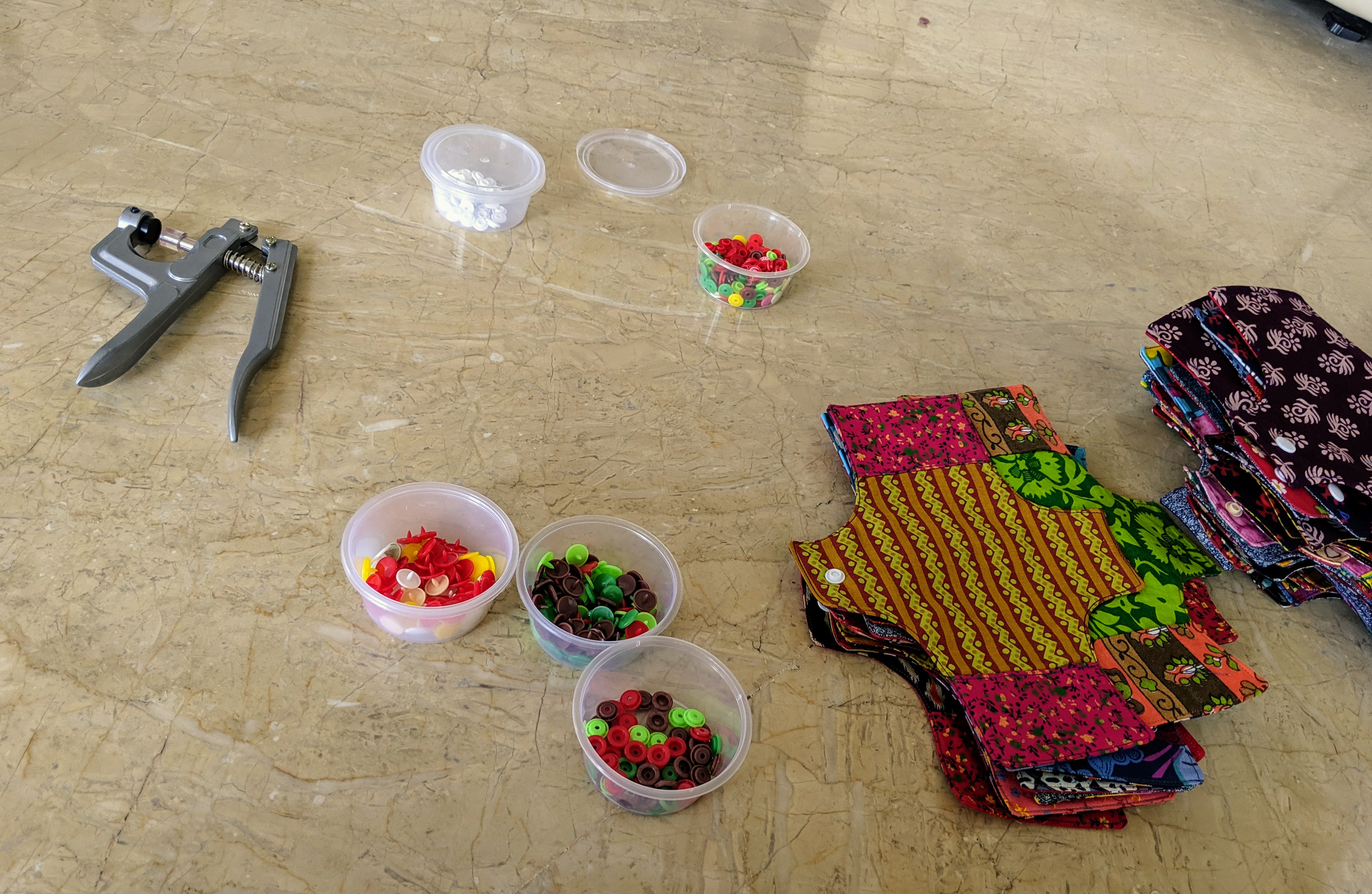 My new Thursday job: attach snaps, fasten and unfasten three times to test for quality before placing in the pile.
