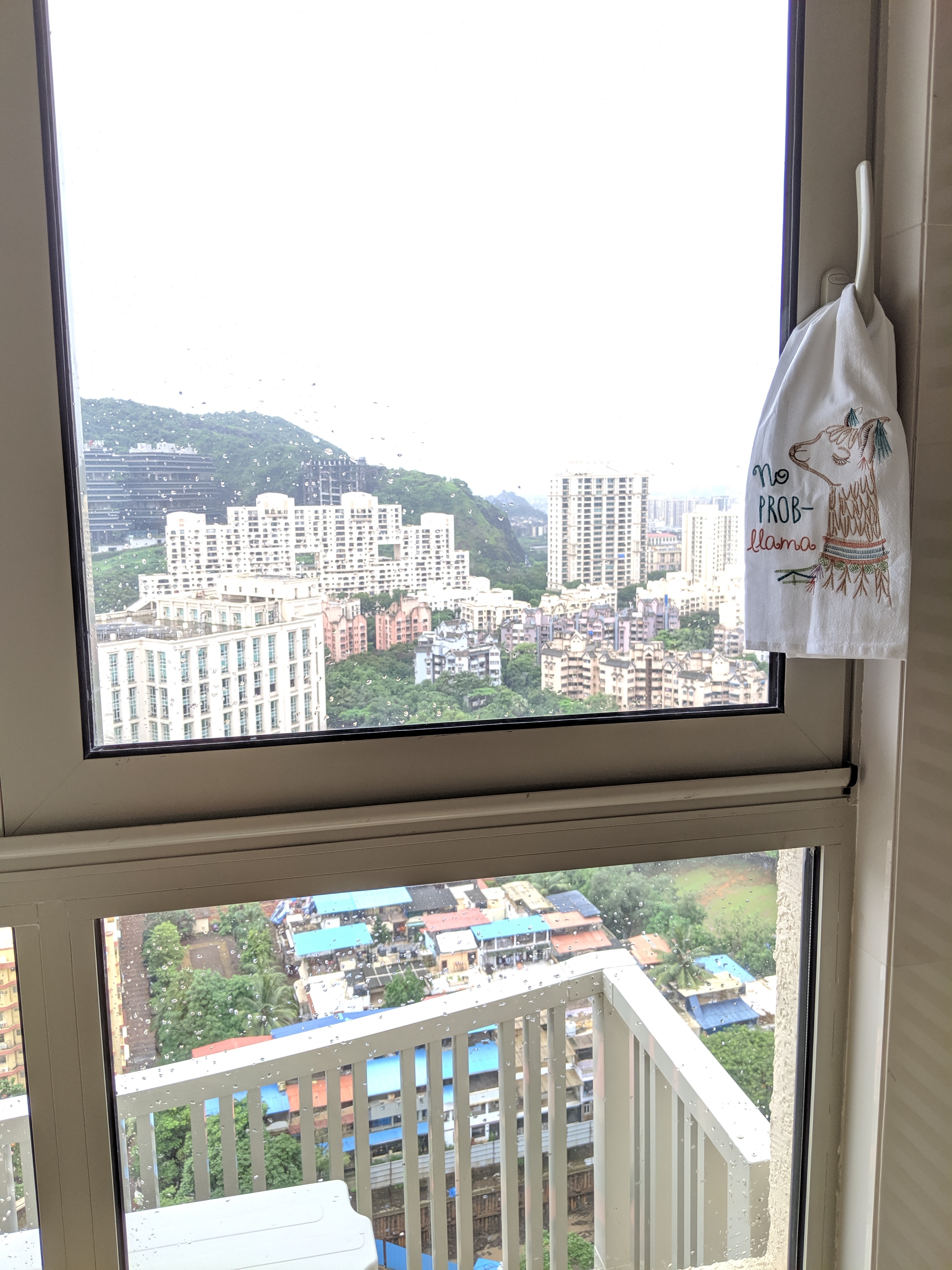 The next morning I see that monsoon season has turned the hill outside our window from brown to emerald. The rains have also brought spiders and mold into the gym in our building. The walls are turning black.